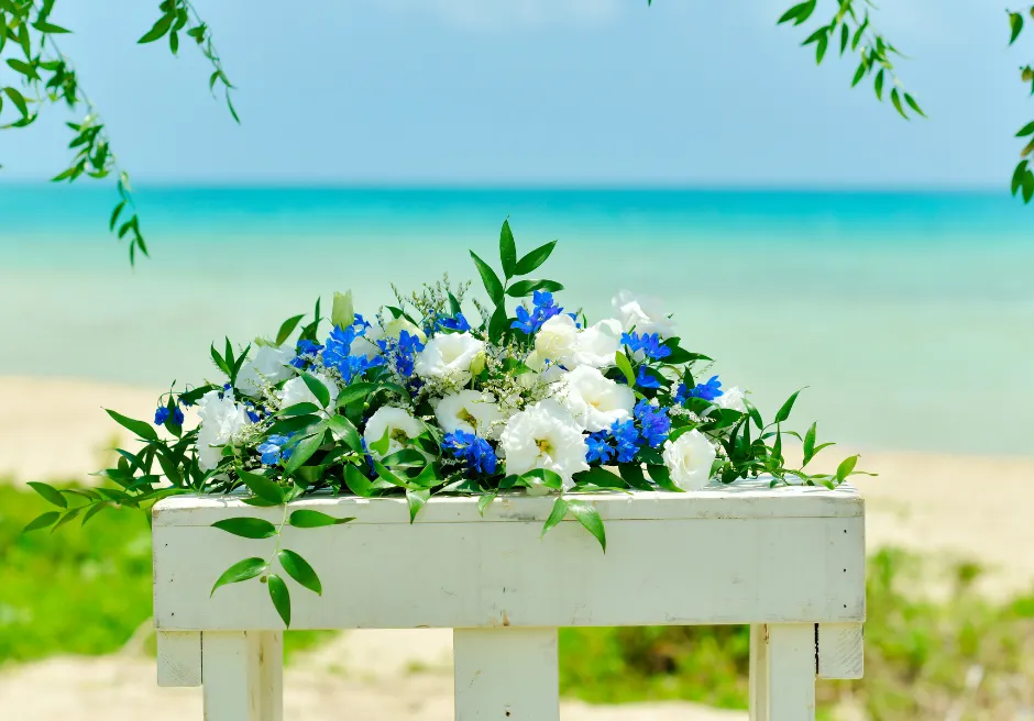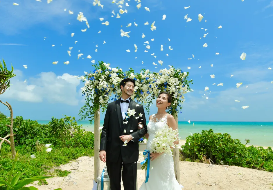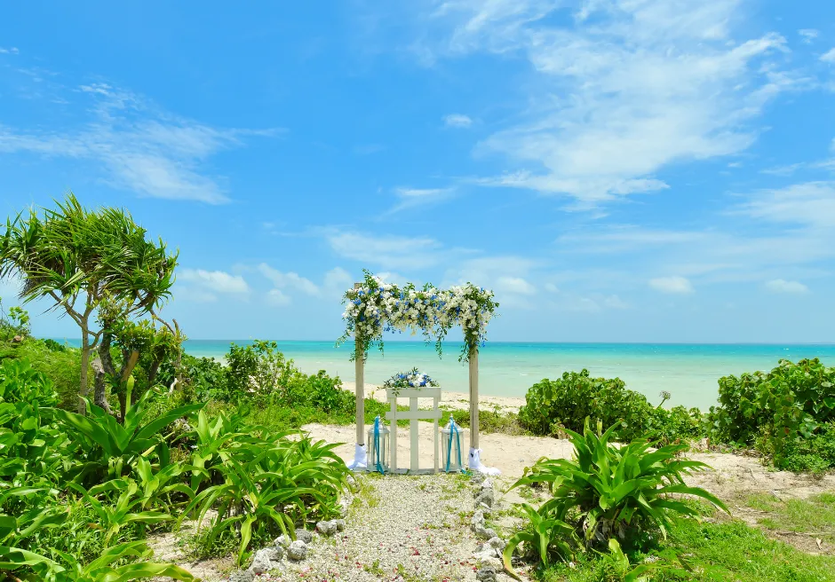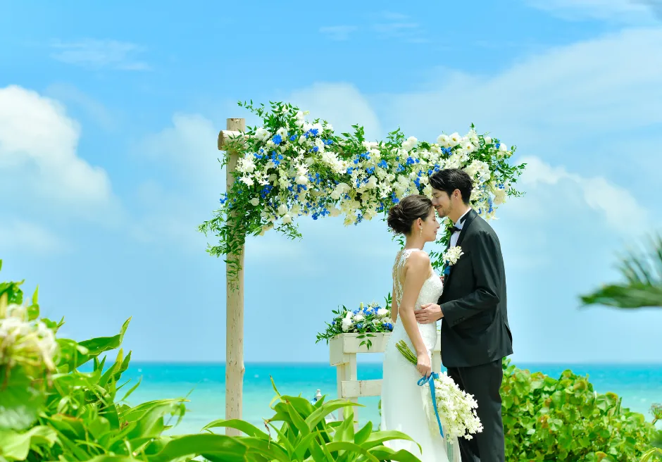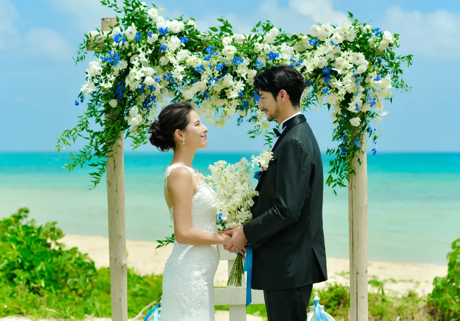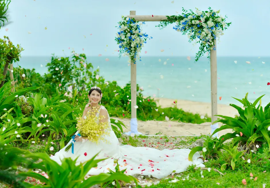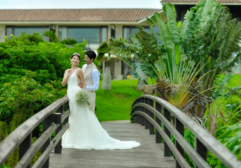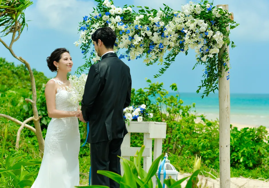二人挙式セレモニー・フォトウェディングのロケーションは、目の前にコバルトブルーとエメラルドグリーンのコントラストが美しい広大な小浜島の海と、真っ白な砂浜が広がる、はいむるぶしリゾート内でも人気のビーチテラスに隣接する緑豊かなガーデンとなります。前撮りフォトウェディング撮影はビーチテラス・ビーチ・各ガーデン・ブリッジ・アダンの森など撮影時間60分以内でご希望の場所で撮影が可能です。カメラマンとは別にコーディネーターが挙式入場から退場およびフォト撮影中のウェディングシーン・リクエストカットの管理、撮影中の衣装、汗、小物のケア、撮影終了後のお着替えサポートをいたします。