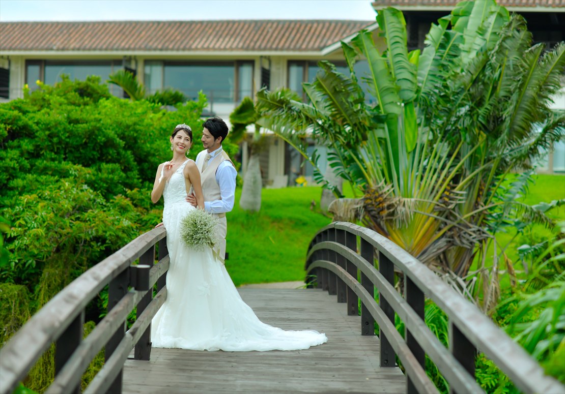 広大な敷地誇る「はいむるぶし」内のリゾートをカートで移動しながら、ビーチテラス、白砂が広がるプライベートビーチ、美しいガーデン、リゾートブリッジなど、ご希望のロケーションで60分撮影が可能です。カメラマンとは別にコーディネーターがウェディングシーン・リクエストカットの管理、撮影中の衣装、汗、小物のケア、撮影終了後のお着替えサポートをいたします。集合時間は10時~14時(撮影開始時間12時~16時)の間でご指定ください。
